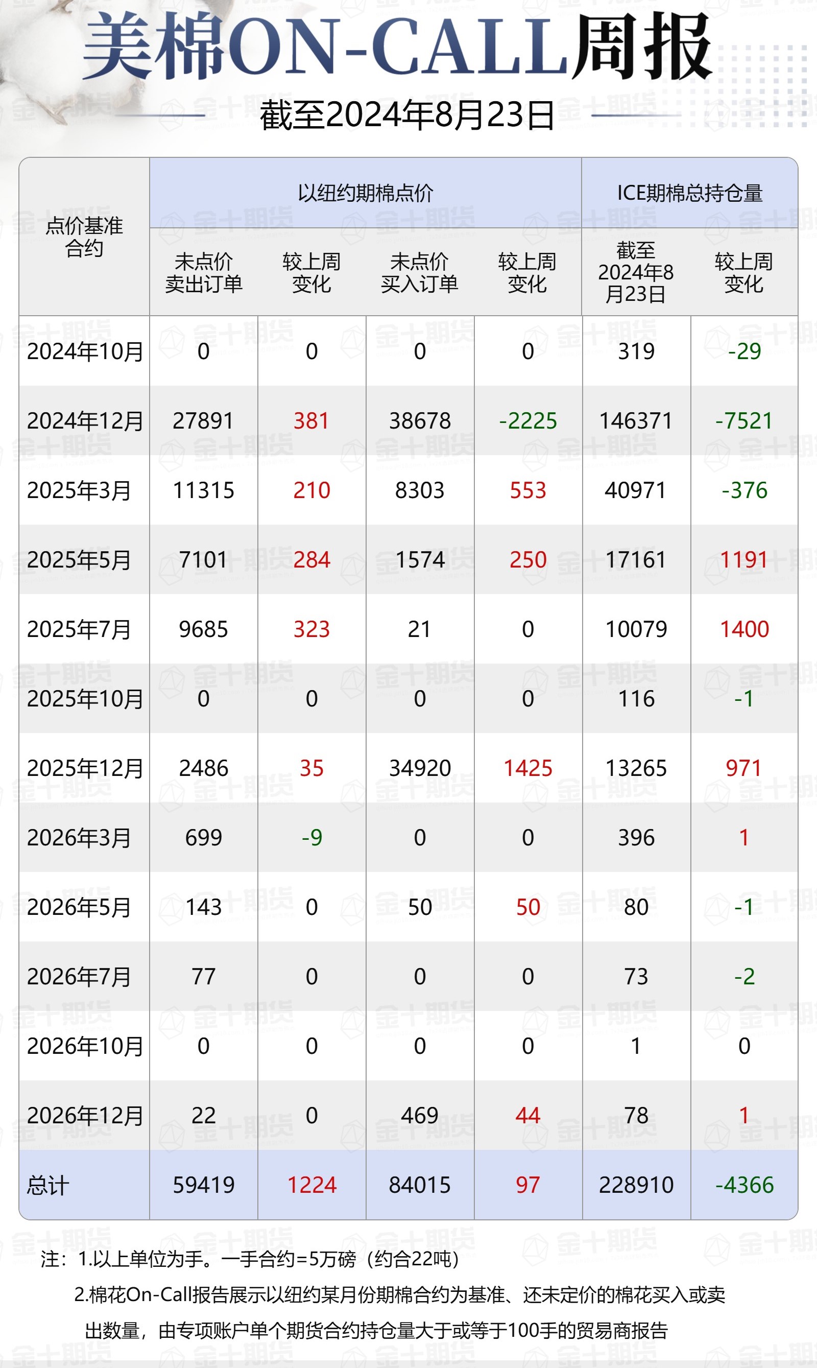 據(jù)美國(guó)商品期貨交易委員會(huì)(CFTC)最新數(shù)據(jù),截至8月23日,①美棉On-Call未點(diǎn)價(jià)賣(mài)出訂單59419手,環(huán)比增加1224手;未點(diǎn)價(jià)買(mǎi)入訂單84015手,環(huán)比增加97手;②ICE期棉2410合約上賣(mài)方未點(diǎn)價(jià)合約為0手,環(huán)比增加0手;③ICE期棉2412合約上賣(mài)方未點(diǎn)價(jià)合約為27891手,環(huán)比增加381手;④ICE期棉2503合約上賣(mài)方未點(diǎn)價(jià)合約為11315手,環(huán)比增加210手;⑤ICE期棉2505合約上賣(mài)方未點(diǎn)價(jià)合約為7101手,環(huán)比增加284手;⑥ICE期棉2507合約上賣(mài)方未點(diǎn)價(jià)合約為9685手,環(huán)比增加323手;⑦ICE棉花期貨盤(pán)面2024/25年度(8月至次年7月)的On-Call合約未點(diǎn)價(jià)賣(mài)出訂單為55992手,環(huán)比增加1198手。
