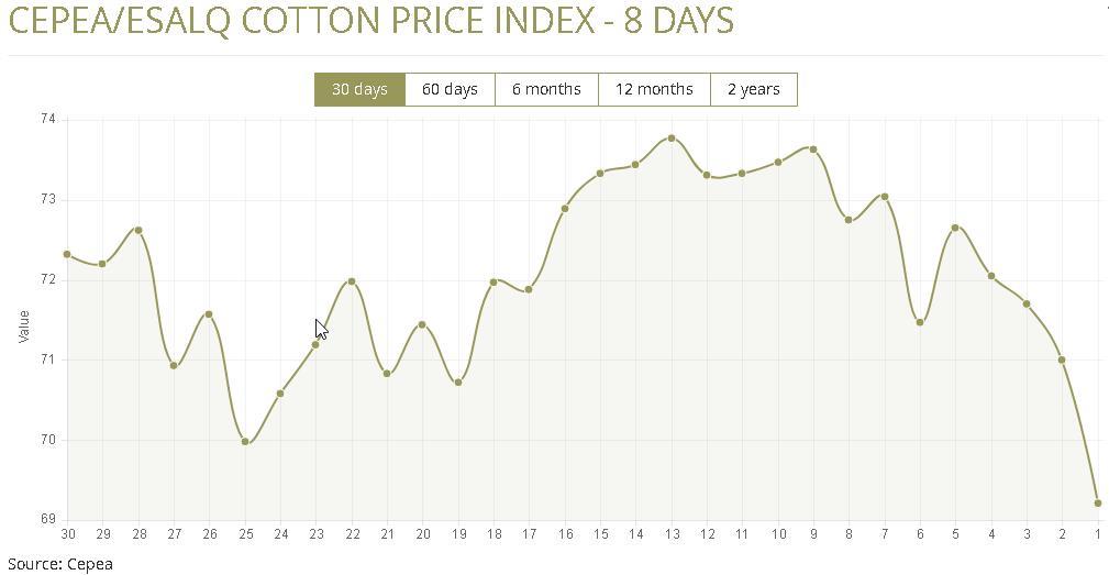 據(jù)外電8月29日消息,8月29日巴西CEPEA/ESALQ棉花價(jià)格指數(shù)報(bào)每磅69.21美分,較前一日下滑2.52%。