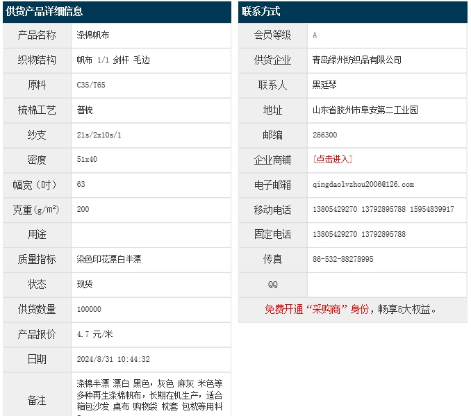 8月31日,青島綠州紡織品有限公司滌棉帆布T65/C35 21s/2x10 51x40 63" 1/1 200g/㎡ 劍桿 毛邊,報價為4.7元/米,實際成交價以協(xié)商為準。[點擊查看詳情]