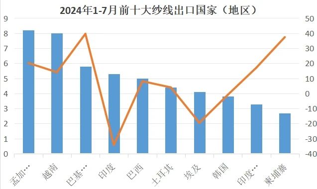 7月對(duì)東盟出口紗線2.6億美元,同比增長(zhǎng)28.1%。