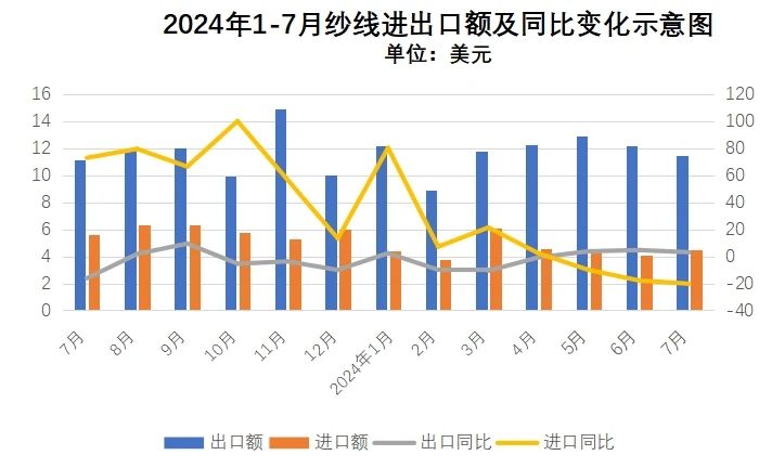2024年1-7月我國進(jìn)口紗線31.8億美元,同比上漲2.8%,進(jìn)口量112.4萬噸,同比增長(zhǎng)8.9%。