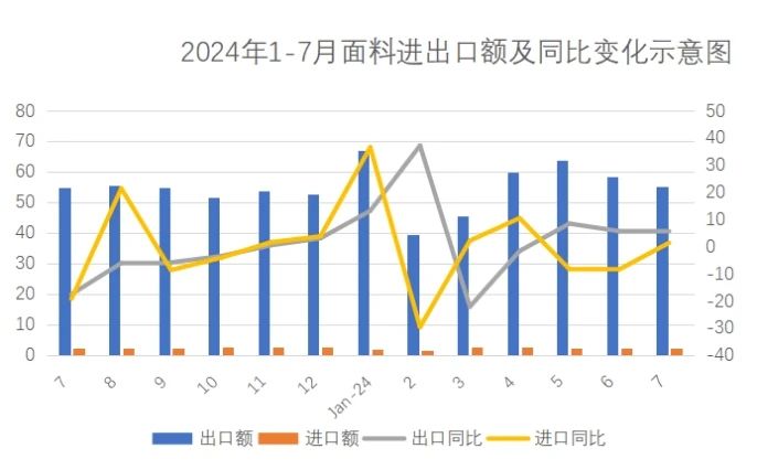 2024年1-7月紡織服裝出口1700.4%,同比增長1.3%。其中紗線面料等中間品出口470.3億美元,同比增長3.1%。其中紗線出口81.7億美元,同比下降1.1%,面料出口388.7億美元,同比增長4.1%,出口增長主要為面料帶動。