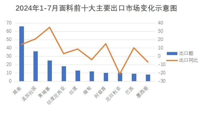 亞洲是我國面料出口的主要市場,2024年1-7月我國對亞洲國家累計出口面料263.7億美元,占面料出口總額的67.8%。在前十大目標(biāo)市場出口中,亞洲市場占了7席。越南作為我國面料出口最大的單一市場,占我國面料對全球出口的17%,出口額66億美元,同比增長14.1%。