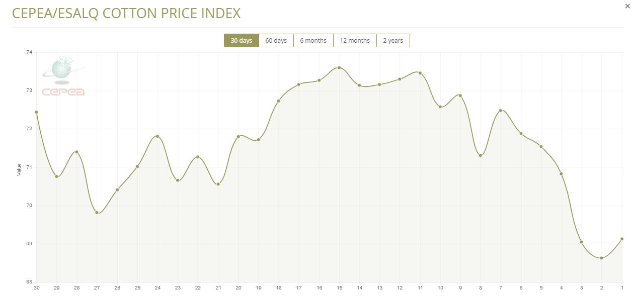 據(jù)外電9月2日消息,9月2日巴西CEPEA/ESALQ棉花價格指數(shù)報每磅69.13美分,較前一日上漲0.73%。