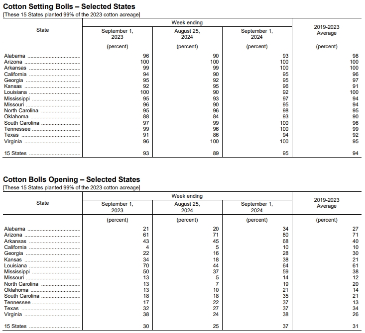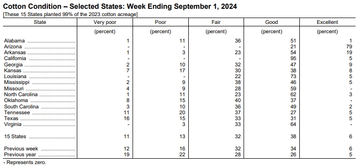 美國農(nóng)業(yè)部(USDA)在每周作物生長報(bào)告中公布稱,截至2024年9月1日當(dāng)周,美棉結(jié)鈴率為95%,前周為89%,上年同期為93%,五年均值為94%。美棉盛鈴率為37%,前周為25%,上年同期為30%,五年均值為31%。美棉優(yōu)良率為44%,前周為40%,上年同期為31%。