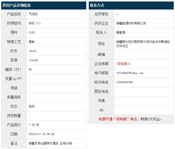 9月5日,新疆勝德紡織有限公司氣流紡純棉布C100 32x32 110x60 96" 斜紋 2/1,報(bào)價(jià)為7元/米,實(shí)際成交價(jià)以協(xié)商為準(zhǔn)。[點(diǎn)擊查看詳情]
