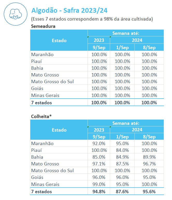 據(jù)巴西農(nóng)業(yè)部下屬的國家商品供應(yīng)公司CONAB,截至9月8日,巴西棉花收割率為95.6%,上周為87.6%,去年同期為94.8%。