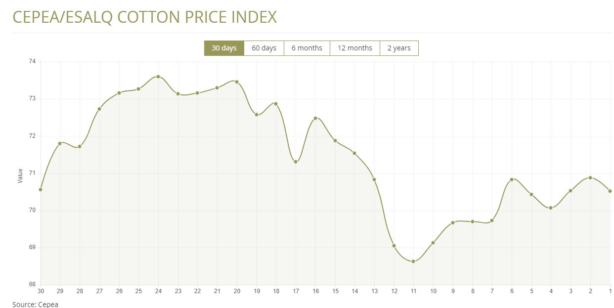 據(jù)外電9月13日消息,9月13日巴西CEPEA/ESALQ棉花價格指數(shù)報每磅70.52美分,較前一日下跌0.51%。
