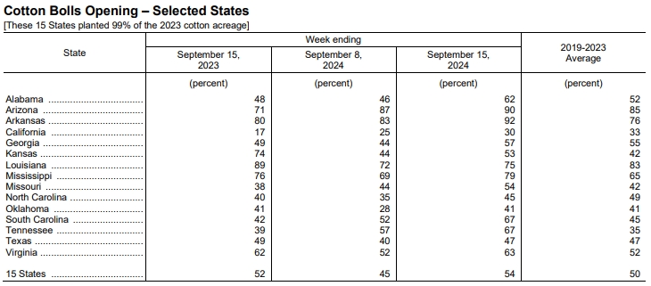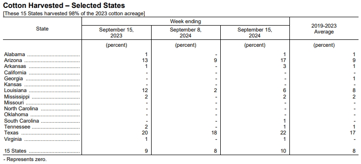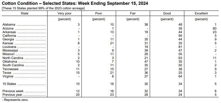 美國農(nóng)業(yè)部(USDA)在每周作物生長報告中公布稱,截至2024年9月15日當周,美棉盛鈴率為54%,前周為45%,上年同期為52%,五年均值為50%。美棉收割率為10%,前周為8%,去年同期為9%,五年均值為8%。美棉優(yōu)良率為39%,前周為40%,上年同期為29%。