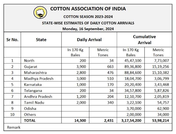 據(jù)外電9月16日消息,印度棉花協(xié)會(CAI)公布,9月16日印度棉花到貨量預(yù)估為14300包(每包170公斤)或2431噸。