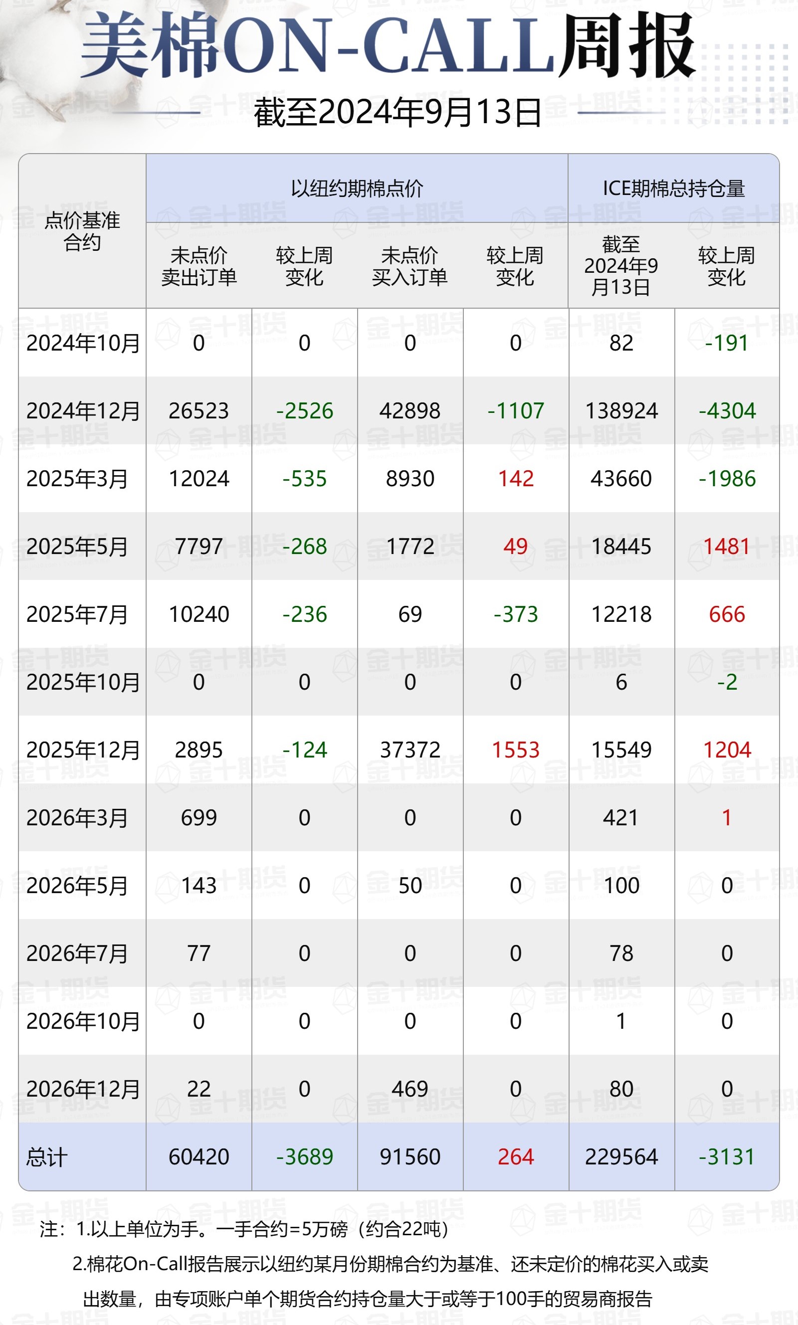 據(jù)美國商品期貨交易委員會(CFTC)最新數(shù)據(jù),截至9月13日,①美棉On-Call未點(diǎn)價(jià)賣出訂單60420手,環(huán)比減少3689手;未點(diǎn)價(jià)買入訂單91560手,環(huán)比增加264手;②ICE期棉2410合約上賣方未點(diǎn)價(jià)合約為0手,環(huán)比增加0手;③ICE期棉2412合約上賣方未點(diǎn)價(jià)合約為26523手,環(huán)比減少2526手;④ICE期棉2503合約上賣方未點(diǎn)價(jià)合約為12024手,環(huán)比減少535手;⑤ICE期棉2505合約上賣方未點(diǎn)價(jià)合約為7797手,環(huán)比減少268手;⑥ICE期棉2507合約上賣方未點(diǎn)價(jià)合約為10240手,環(huán)比減少236手;⑦ICE棉花期貨盤面2024/25年度(8月至次年7月)的On-Call合約未點(diǎn)價(jià)賣出訂單為56584手,環(huán)比減少3565手。