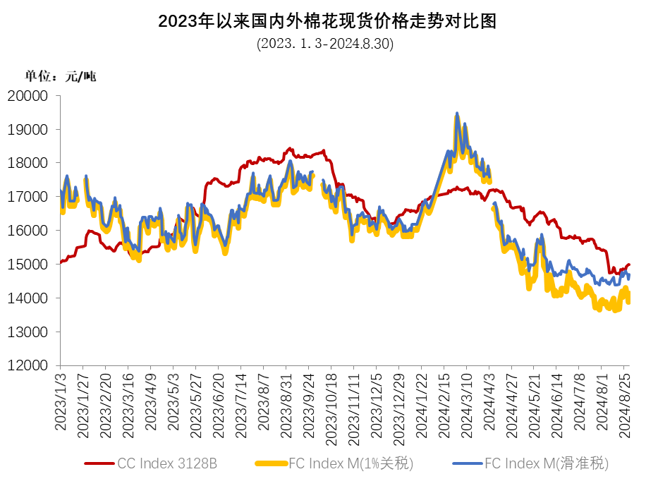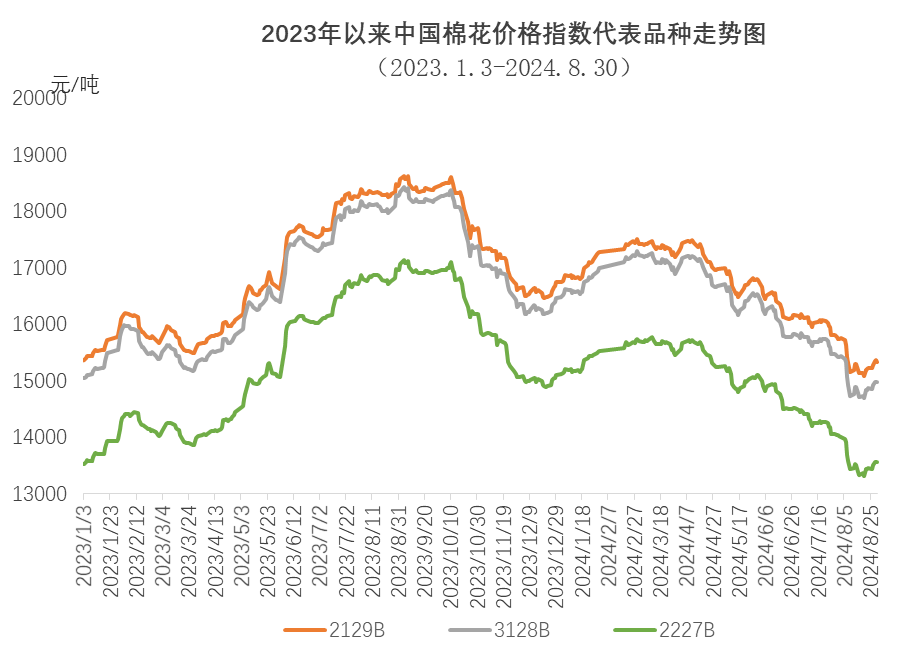 2023/24年度,受棉花供應(yīng)寬松、棉紡織市場季節(jié)性轉(zhuǎn)弱等因素影響,國內(nèi)棉價震蕩回落。年度初期,國內(nèi)棉價創(chuàng)年度最高18433元/噸,之后受新棉上市、儲備棉輪出等多種因素影響,棉價逐步回落;進(jìn)入2024年后,宏觀市場氛圍轉(zhuǎn)好,棉紡織廠訂單充足,對后市信心較強(qiáng),棉價連續(xù)上漲;4月后訂單增長不及預(yù)期,旺季不旺特征明顯,加上新棉豐產(chǎn)預(yù)期較強(qiáng),棉價連續(xù)回落,中國棉花價格指數(shù)(CCIndex3128B)在2024年8月20日達(dá)到年度最低14692元/噸;8月31日中國棉花價格指數(shù)(CCIndex3128B)收于14982元/噸,同比下跌3312元。