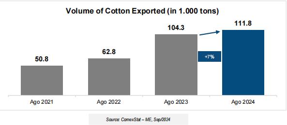巴西棉花2024/25年度開局強勁,首月(8月)出口量達到2019/20年度以來最高水平.
