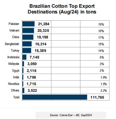 上述3個國家占到8月巴西棉花出口總量的54%。