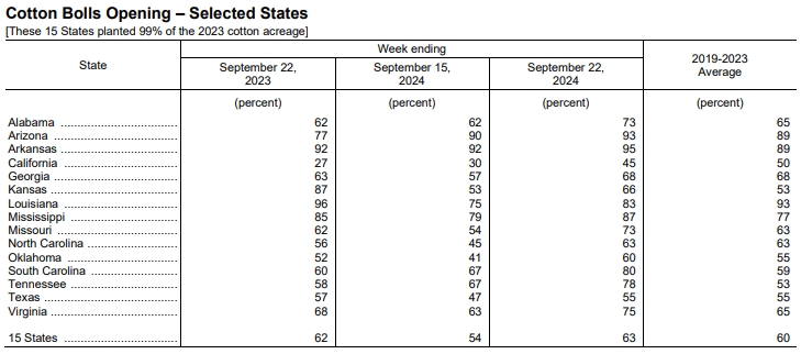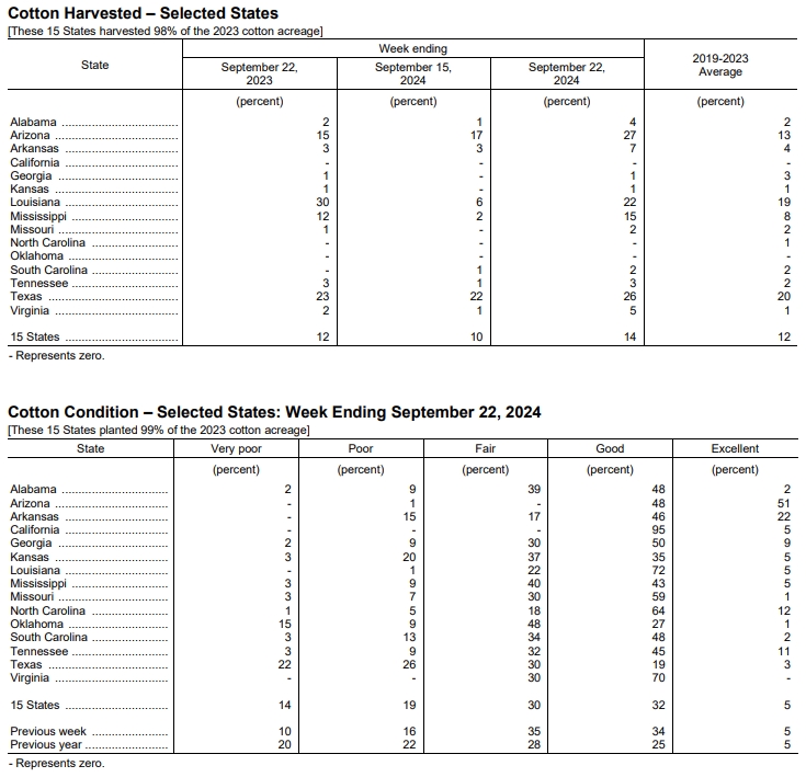 美國(guó)農(nóng)業(yè)部(USDA)在每周作物生長(zhǎng)報(bào)告中公布稱,截至2024年9月22日當(dāng)周,美棉盛鈴率為63%,前周為54%,上年同期為62%,五年均值為60%。美棉收割率為14%,前周為10%,去年同期為12%,五年均值為12%。美棉優(yōu)良率為37%,前周為39%,上年同期為30%。