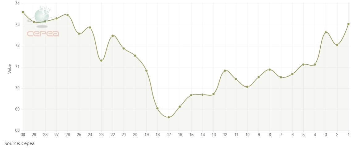 據外電9月23日消息,9月23日巴西CEPEA/ESALQ棉花價格指數報每磅73.04美分,較前一日上漲1.37%。