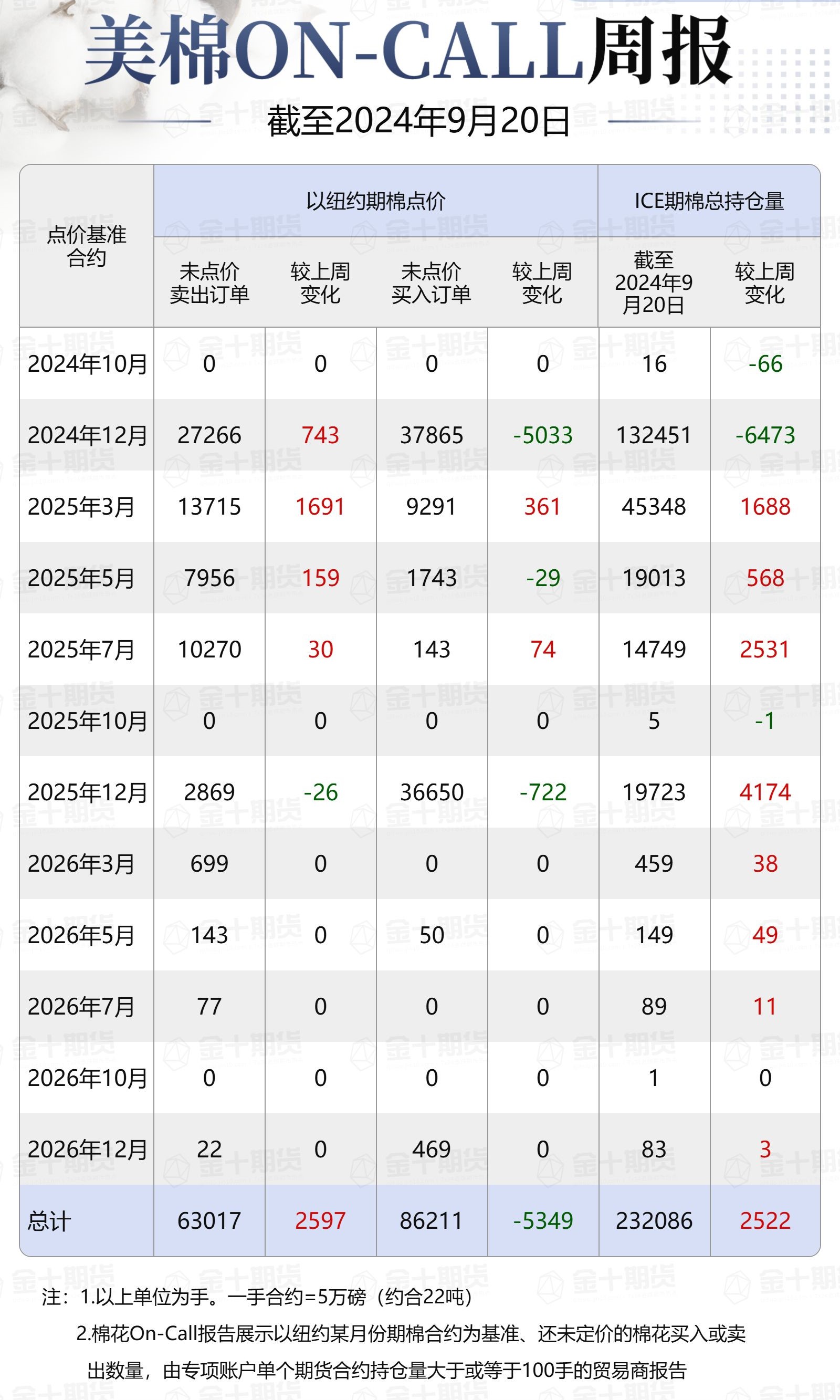 據(jù)美國商品期貨交易委員會(CFTC)最新數(shù)據(jù),截至9月20日,①美棉On-Call未點(diǎn)價(jià)賣出訂單63017手,環(huán)比增加2597手;未點(diǎn)價(jià)買入訂單86211手,環(huán)比減少5349手;②ICE期棉2410合約上賣方未點(diǎn)價(jià)合約為0手,環(huán)比增加0手;③ICE期棉2412合約上賣方未點(diǎn)價(jià)合約為27266手,環(huán)比增加743手;④ICE期棉2503合約上賣方未點(diǎn)價(jià)合約為13715手,環(huán)比增加1691手;⑤ICE期棉2505合約上賣方未點(diǎn)價(jià)合約為7956手,環(huán)比增加159手;⑥ICE期棉2507合約上賣方未點(diǎn)價(jià)合約為10270手,環(huán)比增加30手;⑦ICE棉花期貨盤面2024/25年度(8月至次年7月)的On-Call合約未點(diǎn)價(jià)賣出訂單為59207手,環(huán)比增加2623手。