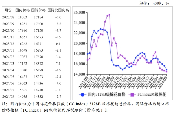 (三)內外棉價差縮小。當前國際棉價低于國內,由于國內棉價跌幅更大,價差比上月縮小。CotlookA指數(shù)(相當于國內3128B級棉花)折合人民幣每噸12534元,比中國棉花價格指數(shù)(CCIndex)3128B級每噸低2421元,價差比上月縮小468元。進口棉價格指數(shù)(FCIndex)M級(相當于國內3128B級棉花)月均價每磅79.15美分,1%關稅下折到岸稅后價每噸13900元,比國內價格低1055元,價差比上月縮小444元;滑準稅下折到岸稅后價每噸14552元,比國內價格低403元,價差比上月縮小544元。