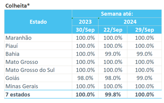 據(jù)巴西農(nóng)業(yè)部下屬的國(guó)家商品供應(yīng)公司CONAB,截至9月29日,巴西棉花收割率為100.0%,上周為99.8%,去年同期為100.0%。