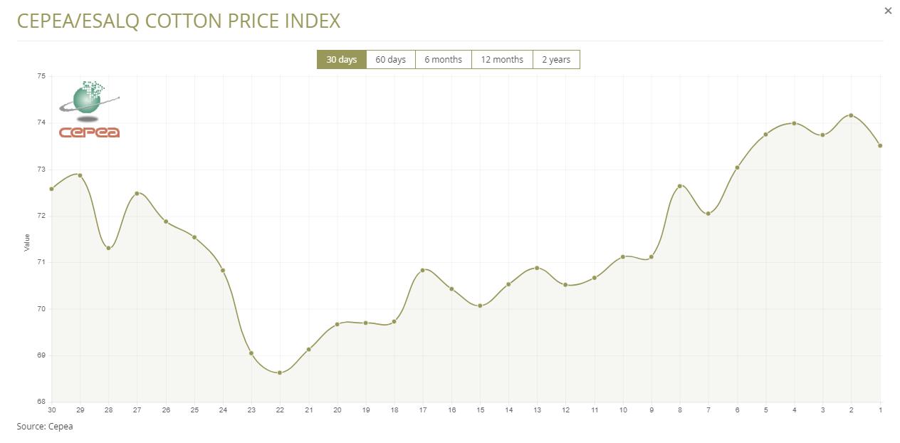 據(jù)外電9月30日消息,9月30日巴西CEPEA/ESALQ棉花價格指數(shù)報每磅73.51美分,較前一日下滑0.88%。