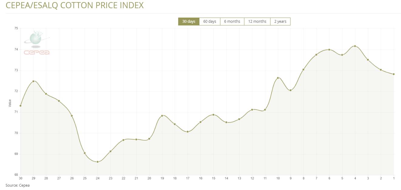 據(jù)外電10月2日消息,10月2日巴西CEPEA/ESALQ棉花價(jià)格指數(shù)報(bào)每磅72.82美分,較前一日下滑0.29%。