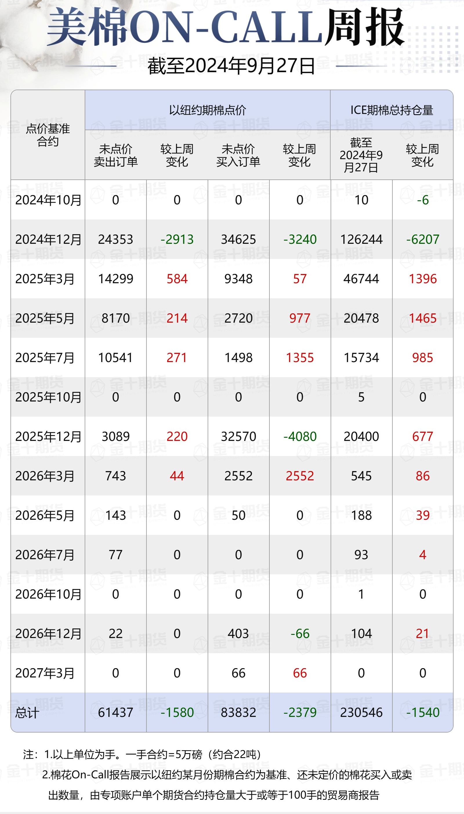 據(jù)美國(guó)商品期貨交易委員會(huì)(CFTC)最新數(shù)據(jù),截至9月27日,①美棉On-Call未點(diǎn)價(jià)賣出訂單61437手,環(huán)比減少1580手;未點(diǎn)價(jià)買入訂單83832手,環(huán)比減少2379手;②ICE期棉2410合約上賣方未點(diǎn)價(jià)合約為0手,環(huán)比增加0手;③ICE期棉2412合約上賣方未點(diǎn)價(jià)合約為24353手,環(huán)比減少2913手;④ICE期棉2503合約上賣方未點(diǎn)價(jià)合約為14299手,環(huán)比增加584手;⑤ICE期棉2505合約上賣方未點(diǎn)價(jià)合約為8170手,環(huán)比增加214手;⑥ICE期棉2507合約上賣方未點(diǎn)價(jià)合約為10541手,環(huán)比增加271手;⑦ICE棉花期貨盤面2024/25年度(8月至次年7月)的On-Call合約未點(diǎn)價(jià)賣出訂單為57363手,環(huán)比減少1844手。