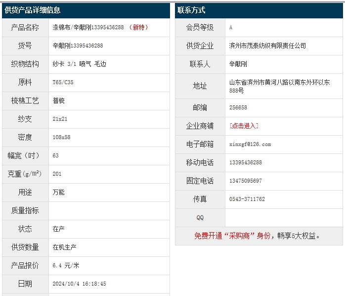 10月4日,濱州茂泰紡織有限責任公司滌棉紗卡T65C35 21x21 108x58 63" 3/1 201g/㎡ 噴氣 毛邊,報價為6.4元/米,實際成交價以協(xié)商為準。[點擊查看詳情]