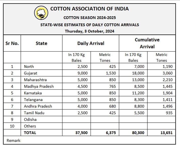 據(jù)外電10月3日消息,印度棉花協(xié)會(huì)(CAI)公布,10月3日印度棉花到貨量預(yù)估為37500包(每包170公斤)或6375噸。