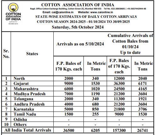 據(jù)外電10月5日消息,印度棉花協(xié)會(CAI)公布,10月5日印度棉花到貨量預估為36500包(每包170公斤)或6205噸。