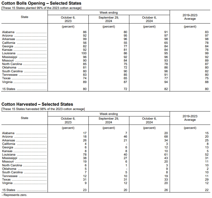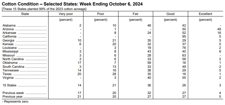 據(jù)外電10月7日消息,美國農(nóng)業(yè)部(USDA)在每周作物生長報告中公布稱,截至2024年10月6日當(dāng)周,美棉盛鈴率為82%,前周為72%,上年同期為80%,五年均值為80%。美棉收割率為26%,前周為20%,去年同期為23%,五年均值為22%。美棉優(yōu)良率為29%,前周為31%,上年同期為32%。