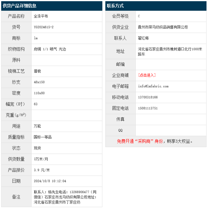 10月8日,晉州榮馬紡織品銷售有限公司純滌平布 T48x150D 110x80 63" 府綢 1/1 噴氣 光邊,報價為3.9元/米,實際成交價以協(xié)商為準(zhǔn)。[點擊查看詳情]