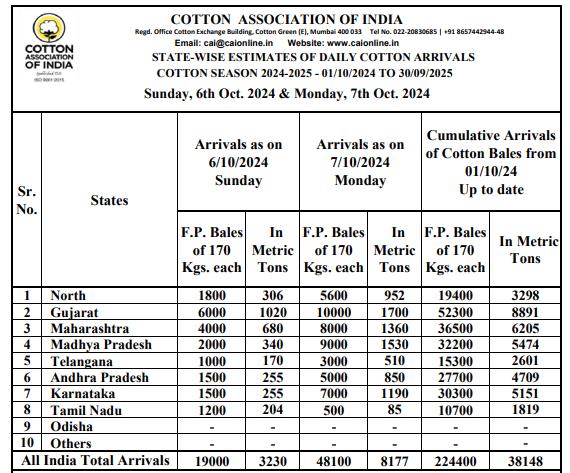 據(jù)外電10月7日消息,印度棉花協(xié)會(huì)(CAI)公布,10月7日印度棉花到貨量預(yù)估為48100包(每包170公斤)或8177噸。