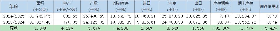 2024/25年度全球棉花期末庫(kù)存預(yù)估為1823.41萬(wàn)噸(上月預(yù)估為1834.29萬(wàn)噸),同比減少1.8%,2023/24年度期末庫(kù)存預(yù)估為1856.27萬(wàn)噸。