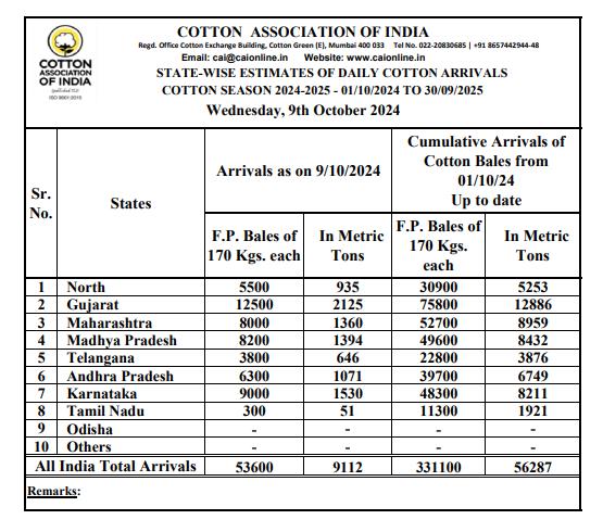 據(jù)外電10月9日消息,印度棉花協(xié)會(huì)(CAI)公布,10月9日印度棉花到貨量預(yù)估為53600包(每包170公斤)或9112噸。