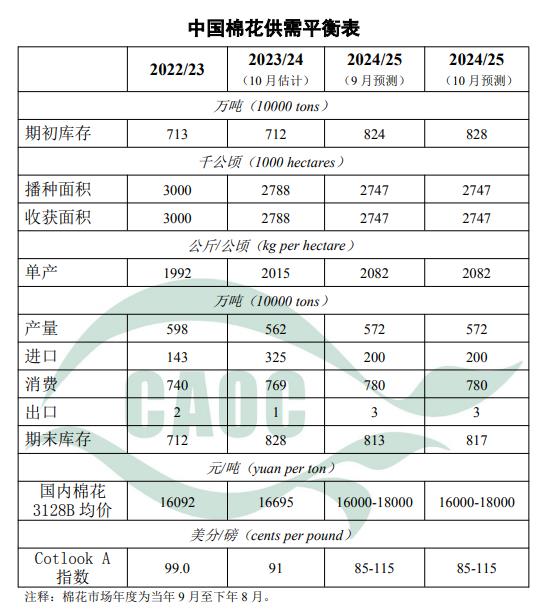 2023/24棉花市場年度結(jié)束。據(jù)海關(guān)統(tǒng)計,本年度中國實際進口量325萬噸,較估值調(diào)增5萬噸,期末庫存調(diào)增至828萬噸。本月預(yù)測,新年度棉花產(chǎn)量、消費量、進口量維持上月預(yù)測不變。全國棉花進入集中采收期,新疆整體采摘進度約20-30%。