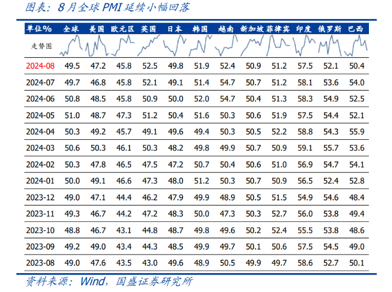 2024年8月中國綜合PMI產出指數(shù)為50.1%,較上月下降0.1個百分點。制造業(yè)PMI分項中,只有產成品庫存和新出口訂單指數(shù)上行,而原材料購進價格和出廠價格指數(shù)下行幅度最大,生產經(jīng)營活動預期和采購量指數(shù)也呈顯著下降。這意味著當前工業(yè)領域仍面臨需求不足、被動補庫的局面,且企業(yè)預期有轉弱跡象。