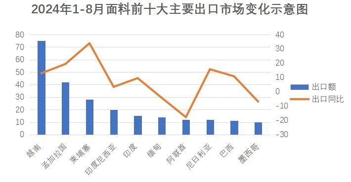 亞洲是我國面料出口主要市場,2024年1-8月我國對亞洲國家出口面料301.2億美元,占面料出口總額的67.4%。在前十大目標市場出口中,亞洲市場占7席。越南作為我國面料出口最大的單一市場,占我國面料對全球出口的16.8%,出口額74.9億美元,同比增長12.9%。