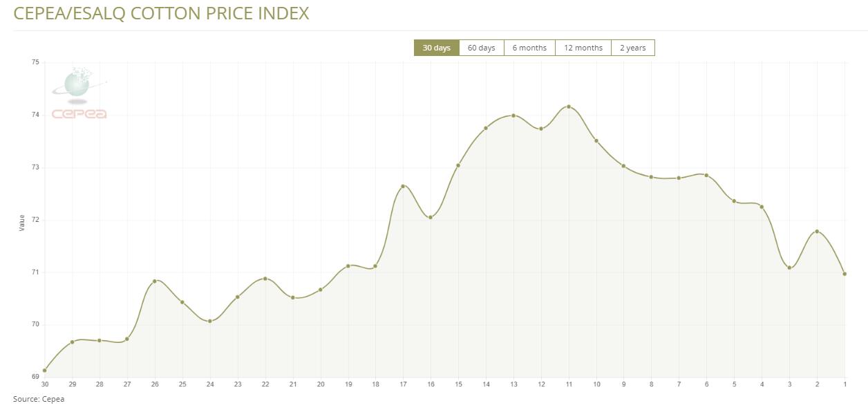 據外電10月11日消息,10月11日巴西CEPEA/ESALQ棉花價格指數報每磅70.97美分,較前一日下跌1.13%。