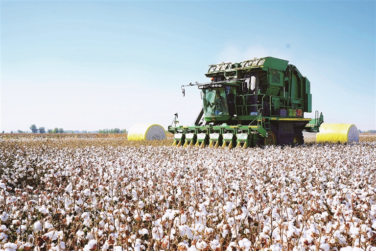 10月3日,在吉木薩爾縣三臺鎮(zhèn)東地村,1臺棉花采收打包一體機(jī)來回穿梭采收棉花。