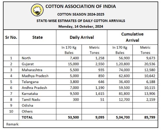 據(jù)外電10月14日消息,印度棉花協(xié)會(CAI)公布,10月14日印度棉花到貨量預(yù)估為53500包(每包170公斤)或9095噸。