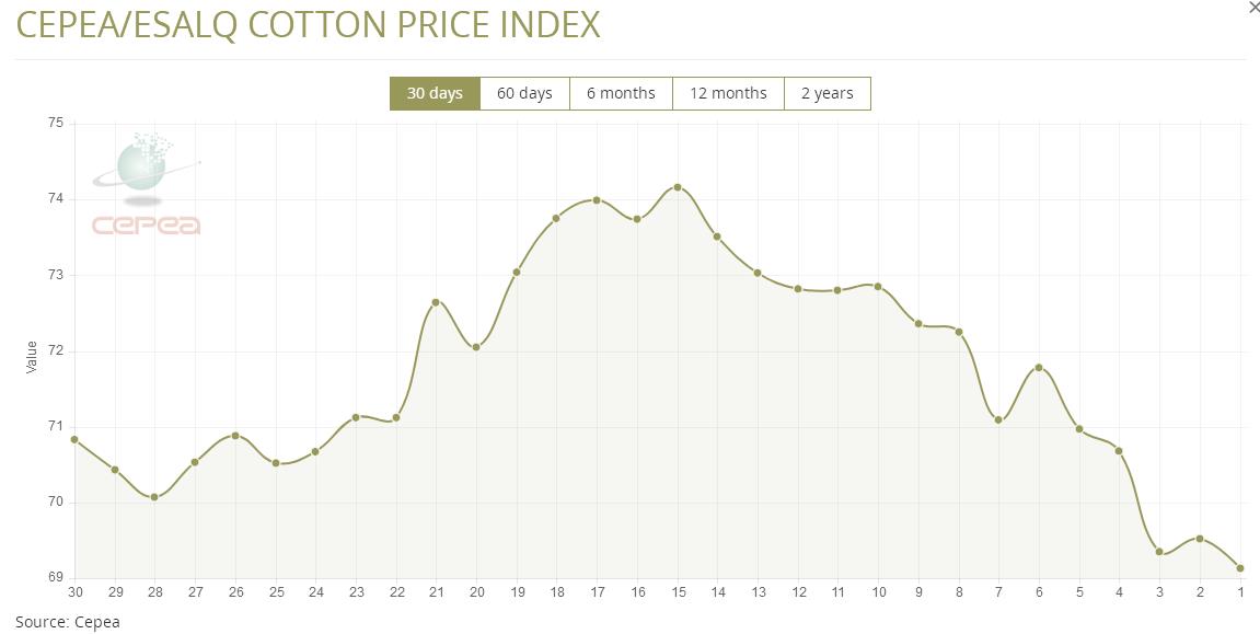 據(jù)外電10月17日消息,10月17日巴西CEPEA/ESALQ棉花價(jià)格指數(shù)報(bào)每磅69.13美分,較前一日下跌0.56%。