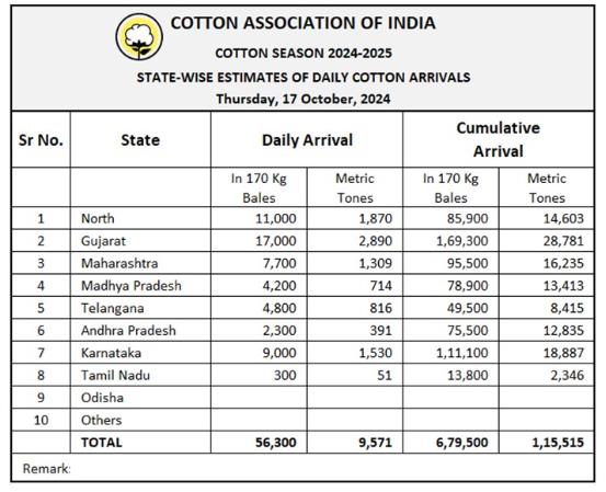 2024/25年度(10月至次年9月)迄今,印度棉花到貨量為679500包或115515噸。