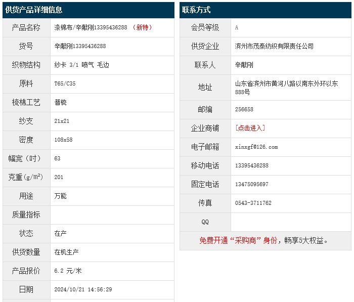 10月21日,濱州茂泰紡織有限責(zé)任公司滌棉紗卡T65/C35 21x21 108x58 63" 3/1 201g/㎡ 噴氣 毛邊,報(bào)價(jià)為6.2元/米,實(shí)際成交價(jià)以協(xié)商為準(zhǔn)。[點(diǎn)擊查看詳情]