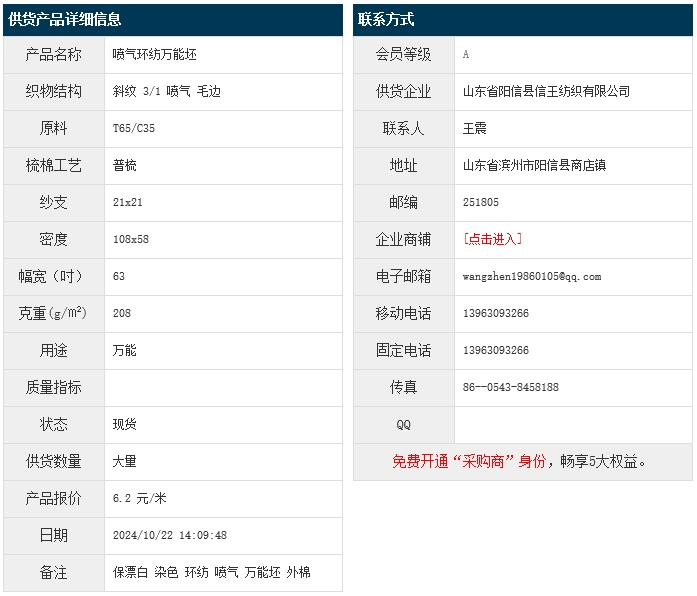 10月22日,山東陽信縣信王紡織有限公司滌棉斜紋T65/C35 21x21 108x58 63" 3/1 208g/㎡ 噴氣 毛邊,報價為6.2元/米,實際成交價以協(xié)商為準(zhǔn)。[點擊查看詳情]
