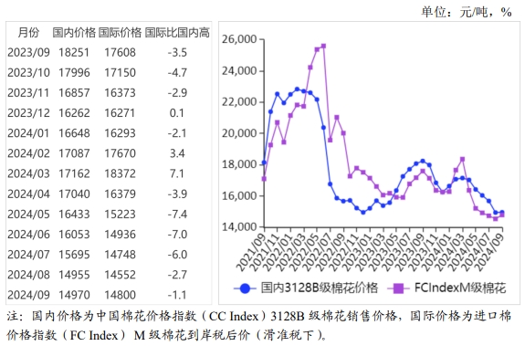 (一)國內(nèi)棉價(jià)小幅上漲。9月,下游紡織市場需求略有回升,產(chǎn)銷率有所提高,價(jià)格小幅上漲。據(jù)國家棉花市場監(jiān)測系統(tǒng)抽樣調(diào)查,9月初被調(diào)查紡織廠紗、布產(chǎn)銷率分別98.4%、99.0%,環(huán)比分別提高2.4個(gè)、1.4個(gè)百分點(diǎn),較近5年同期平均水平分別提高3.4個(gè)、5.3個(gè)百分點(diǎn)。9月國內(nèi)3128B級(jí)棉花月均價(jià)每噸14970元,環(huán)比漲0.1%,同比跌18.0%。鄭棉期貨主力合約(CF2501)月結(jié)算價(jià)每噸14250元,環(huán)比漲3.5%,同比跌17.1%。