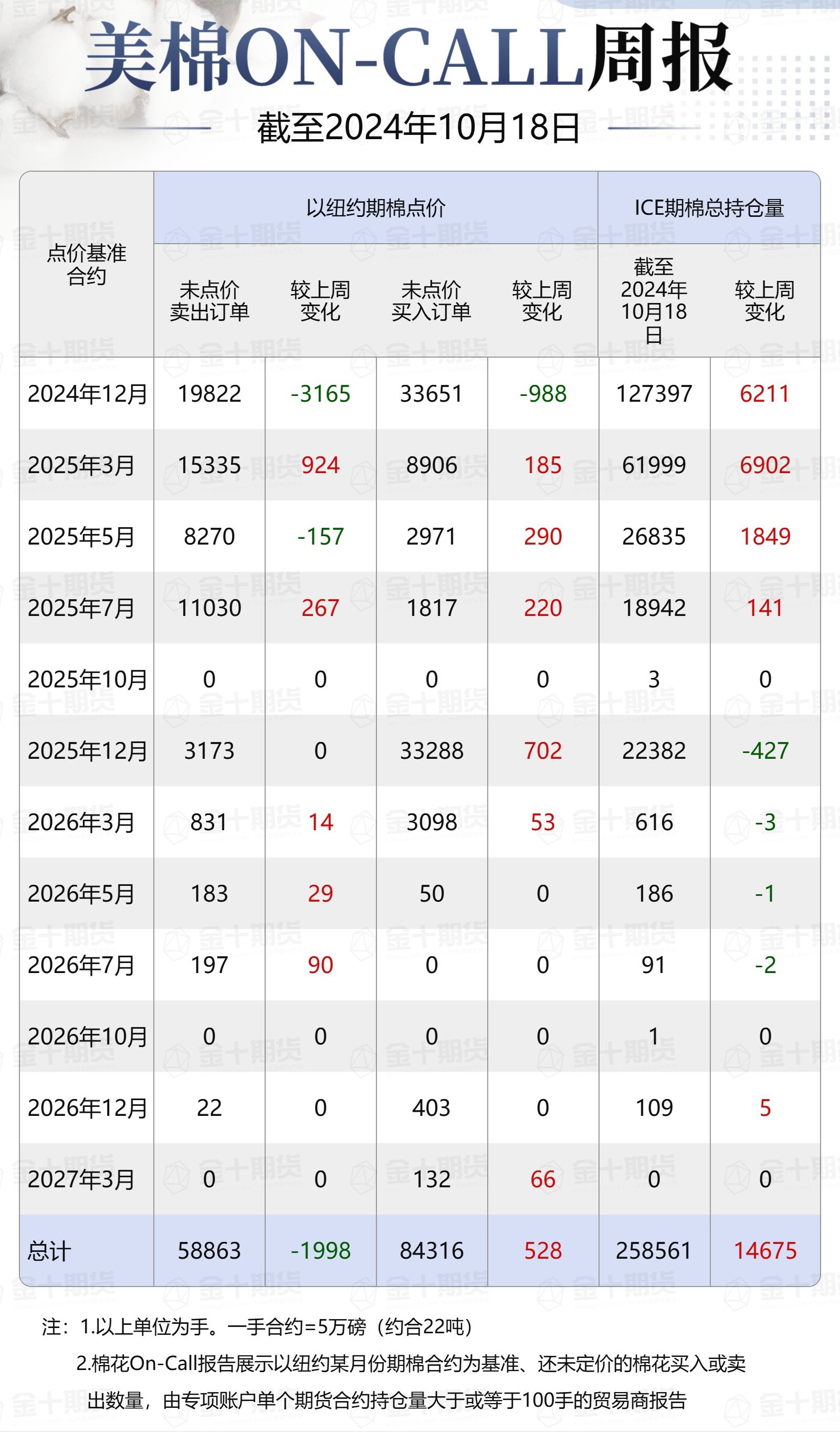 據(jù)美國商品期貨交易委員會(CFTC)最新數(shù)據(jù),截至10月18日,①美棉On-Call未點(diǎn)價賣出訂單58863手,環(huán)比減少1998手;未點(diǎn)價買入訂單84316手,環(huán)比增加528手;②ICE期棉2412合約上賣方未點(diǎn)價合約為19822手,環(huán)比減少3165手;③ICE期棉2503合約上賣方未點(diǎn)價合約為15335手,環(huán)比增加924手;④ICE期棉2505合約上賣方未點(diǎn)價合約為8270手,環(huán)比減少157手;⑤ICE期棉2507合約上賣方未點(diǎn)價合約為11030手,環(huán)比增加267手;⑥ICE棉花期貨盤面2024/25年度(8月至次年7月)的On-Call合約未點(diǎn)價賣出訂單為54457手,環(huán)比減少2131手。