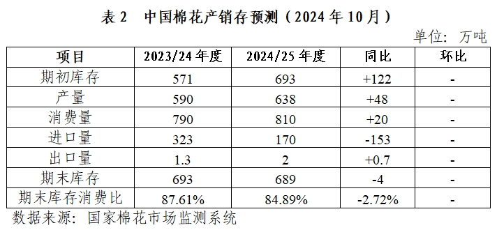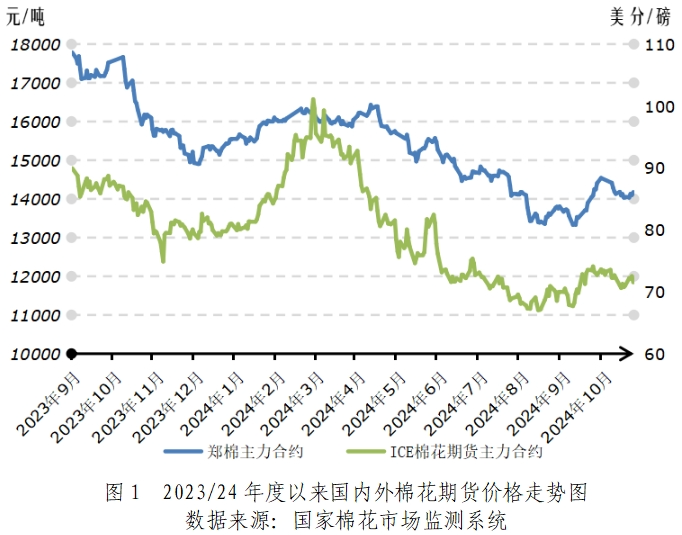 進(jìn)入10月,各主產(chǎn)國(guó)棉花上市進(jìn)度加快,美國(guó)農(nóng)業(yè)部上調(diào)全球棉花產(chǎn)量、下調(diào)貿(mào)易量,全球棉花產(chǎn)需形勢(shì)仍較寬松。國(guó)內(nèi)在紡織傳統(tǒng)旺季需求提振下企業(yè)開機(jī)率提升,紗線去庫(kù)取得進(jìn)展,產(chǎn)區(qū)新棉采摘進(jìn)入高峰期,籽棉收購(gòu)價(jià)有所回落,皮棉加工上市量同比加快,國(guó)內(nèi)外棉花期貨價(jià)格承壓下行后進(jìn)入盤整,現(xiàn)貨價(jià)格相對(duì)堅(jiān)挺。截至10月24日,ICE棉花期貨主力合約結(jié)算價(jià)為71.53美分/磅,較上月末下跌2.08美分/磅,跌幅2.8%;代表進(jìn)口棉中國(guó)主港到岸均價(jià)的國(guó)際棉花指數(shù)(M)為82.39美分/磅,較上月末上漲1.97美分/磅,折人民幣進(jìn)口成本14171元/噸(1%關(guān)稅,不含港雜費(fèi)),較上月末上漲253元/噸,漲幅1.8%。鄭州商品交易所棉花期貨主力合約結(jié)算價(jià)為14140元/噸,較上月末下跌365元/噸,跌幅2.5%;代表內(nèi)地標(biāo)準(zhǔn)級(jí)皮棉市場(chǎng)價(jià)格的國(guó)家棉花價(jià)格B指數(shù)為15444元/噸,較上月末上漲98元/噸,漲幅0.6%。