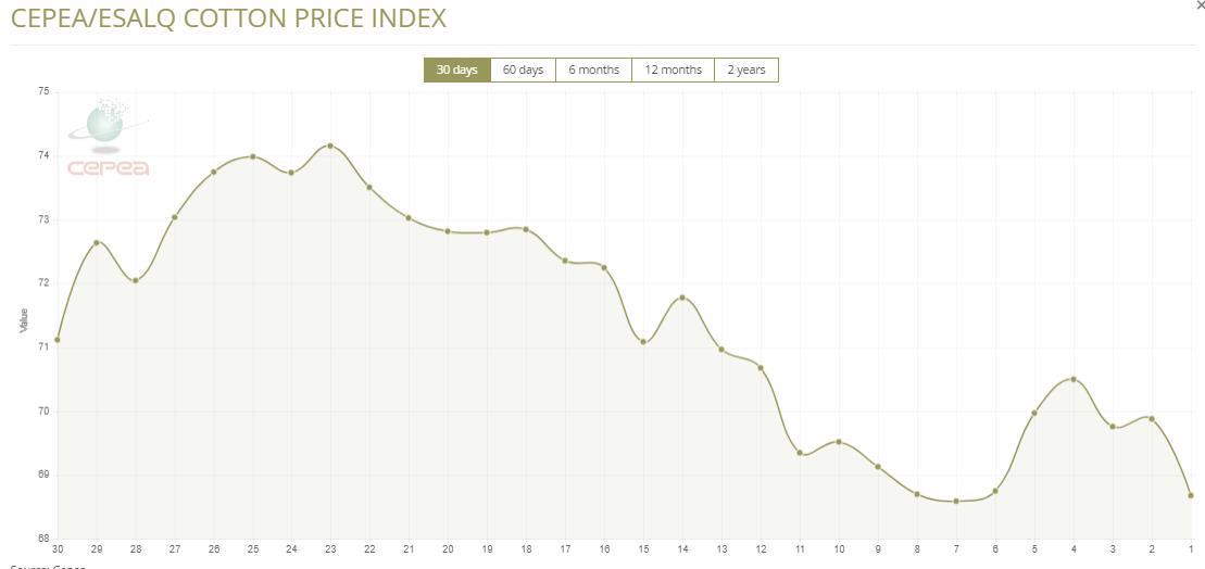 據(jù)外電10月29日消息,10月29日巴西CEPEA/ESALQ棉花價格指數(shù)報每磅68.68美分,較前一日下滑1.72%。