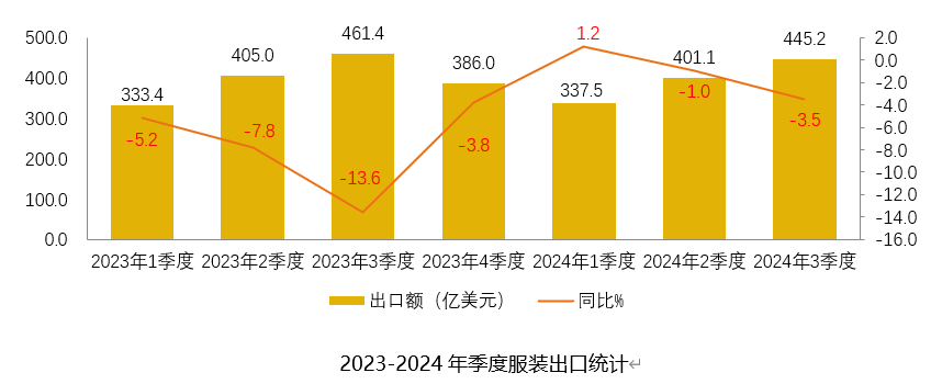 據(jù)中國(guó)海關(guān)統(tǒng)計(jì),1-9月我國(guó)服裝(含衣著附件,下同)出口1183.8億美元,同比下降1.3%。從各季度出口看,1季度出口小幅增長(zhǎng),出口337.5億美元,同比增長(zhǎng)1.2%。2季度和3季度在去年基數(shù)較小下仍出現(xiàn)下降,且降幅呈擴(kuò)大趨勢(shì)。2季度出口401.1億美元,同比下降1%。3季度出口445.2億美元,同比下降3.5%。9月出口135.3億美元,同比下降5.1%。