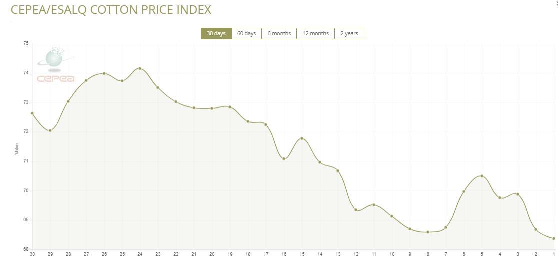 據外電10月30日消息,10月30日巴西CEPEA/ESALQ棉花價格指數報每磅68.37美分,較前一日下滑0.45%。